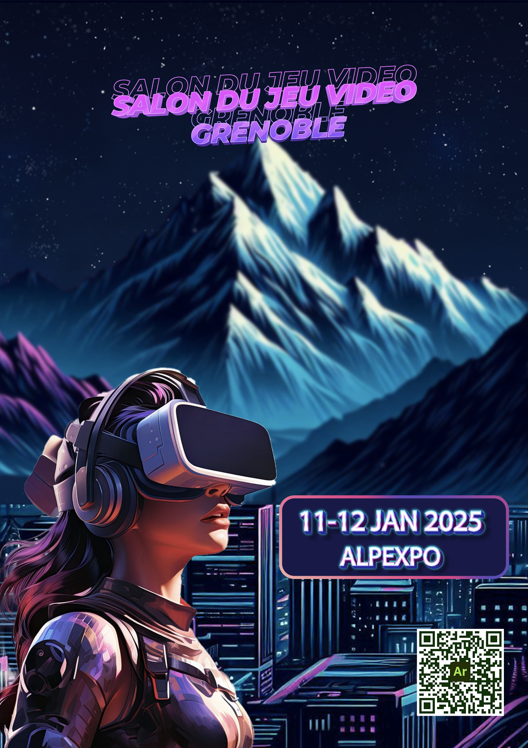 Affiche de réalité augmentée style cyberpunk pour un salon du jeu video.